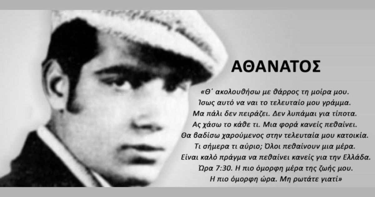 Στο τελευταίο γράμμα του έγραψε: «Θ’ ακολουθήσω με θάρρος τη μοίρα μου. Ίσως αυτό να’ ναι το τελευταίο μου γράμμα. Μα πάλι δεν πειράζει. Δεν λυπάμαι για τίποτα. Ας χάσω το κάθε τι. Μια φορά κανείς πεθαίνει. Θα βαδίσω χαρούμενος στην τελευταία μου κατοικία. Τι σήμερα, τι αύριο; Όλοι πεθαίνουν μια μέρα. Είναι καλό πράγμα να πεθαίνει κανείς για την Ελλάδα. Ώρα 7:30. Η πιο όμορφη μέρα της ζωής μου. Η πιο όμορφη ώρα. Μη ρωτάτε γιατί»…